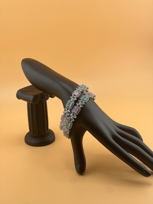 Pink+Mint Green Indian Silver American Diamond | CZ Bangles | Emerald Diamond Silver Bangle | CZ Diamond Bangle | Indian bangles | Bridal bangles | Bracelet | Indian Wedding Jewelry | Cubic Zirconia Bangle Jewelry Pack of 2