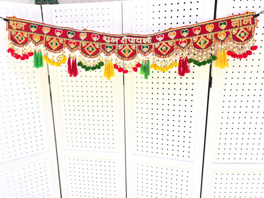 Shubh Labh Welcome Mirror Beads Toran Bandanwar Door Wall Cloth Hanging Traditional Indian Home Office Temple Pooja Deepawali Festival Decor Decoration Gifting