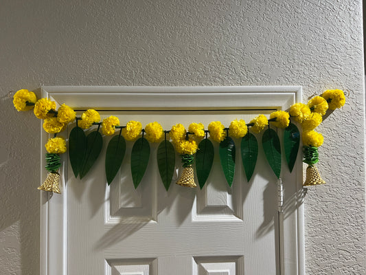 Artificial Marigold Flower Garlands with Bell and Mango Leaf Yellow Door Toran/Decorative Hanging Bandanwar for Parties Indian Puja New Year Décor